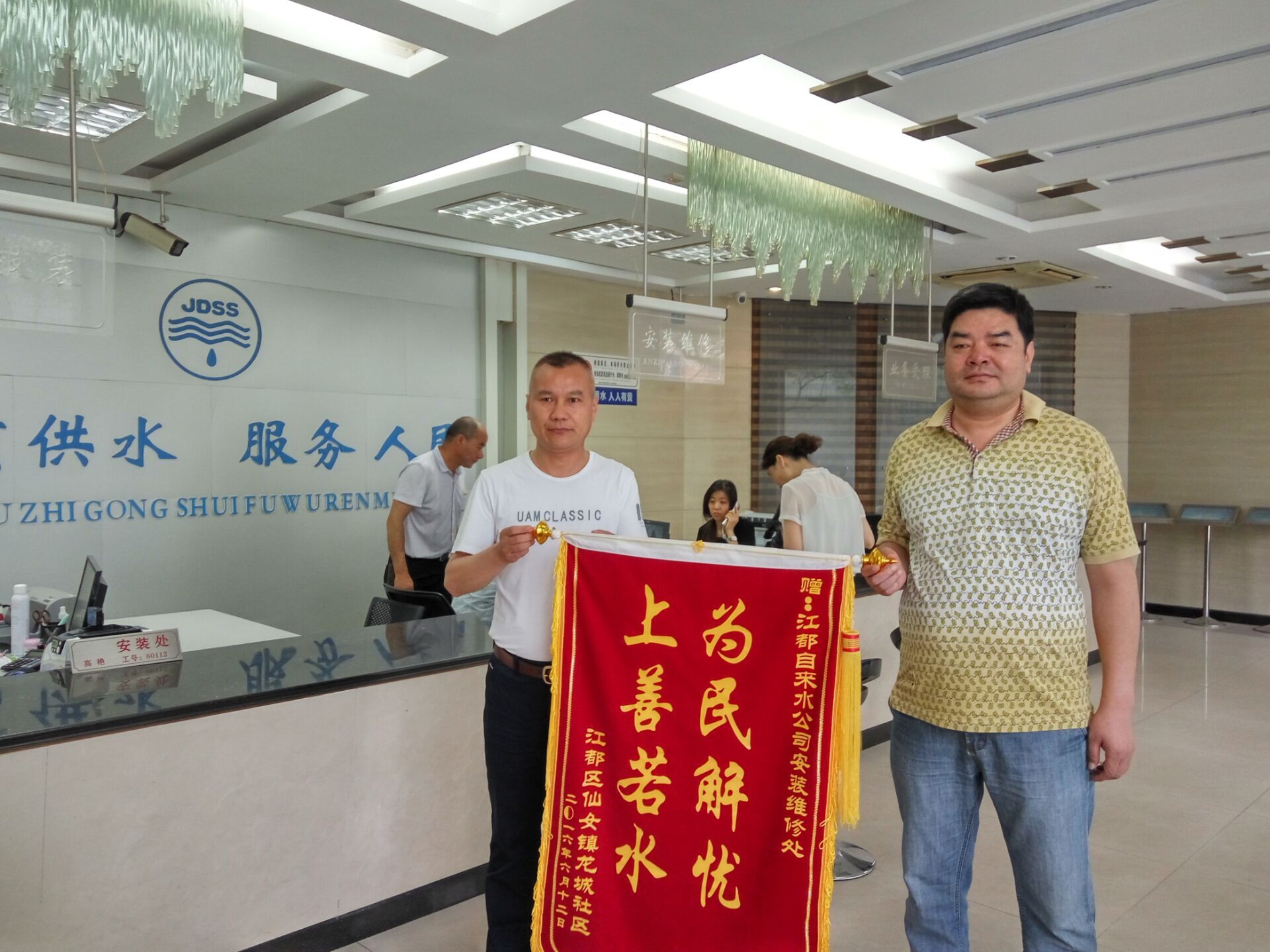日前,仙女鎮龍城社區將一面寫有“為民解憂、上善若水”的錦旗贈送給公司安裝維修服務處,感謝公司幫助150多戶居民順利完成進水管網改造。