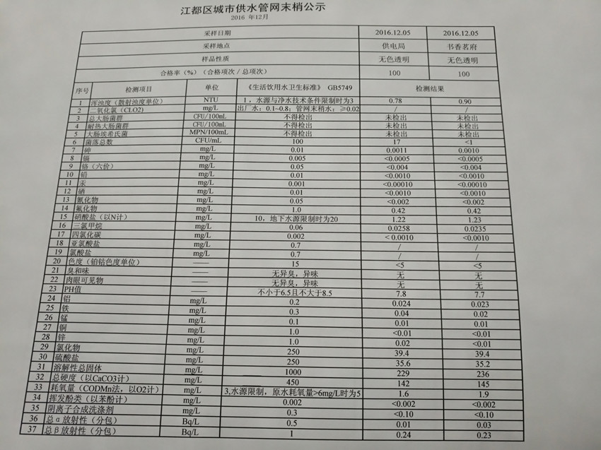 2016年12月江都區(qū)城市供水管網(wǎng)末梢公示