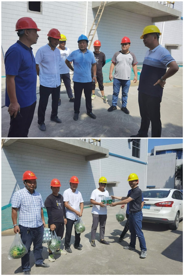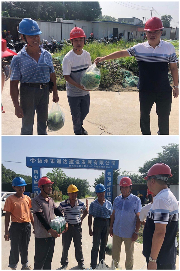 近日來,揚(yáng)城開啟了“燒烤”模式,為做好高溫季節(jié)防暑降溫工作,切實(shí)保障廣大施工人員的安全健康,有效促進(jìn)重點(diǎn)工程建設(shè),8.18日上午,在龍川控股集團(tuán)副總兼公司執(zhí)行董事張勇帶領(lǐng)下,集團(tuán)與公司黨政工領(lǐng)導(dǎo)代表頂著酷暑,帶著慰問品來到二、三水廠深度處理改造工程項(xiàng)目施工現(xiàn)場(chǎng),對(duì)在高溫下作業(yè)的建設(shè)者進(jìn)行親切慰問。