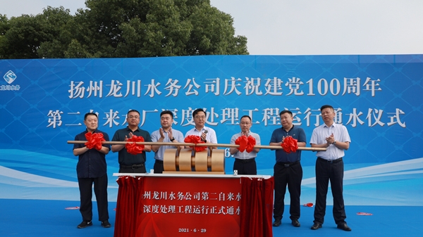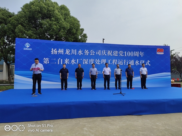 6月29日上午,在喜迎中國共產(chǎn)黨百年華誕之際,揚(yáng)州龍川水務(wù)公司在第二自來水廠隆重舉行深度處理工程運(yùn)行通水儀式。江都區(qū)副區(qū)長楊曉榮、發(fā)改委副主任王安國、住建局副局長高翔宇、水務(wù)局副局長高寅峰、衛(wèi)健委副主任劉俊杰,以及揚(yáng)州龍川控股集團(tuán)黨委書記、董事長朱成勇,黨委副書記、總經(jīng)理高鵬應(yīng)邀出席活動。龍川控股集團(tuán)各單位代表、龍川水務(wù)全體領(lǐng)導(dǎo)班子成員、中層干部及其下屬各單位三級以上管理人員、全體黨員以及工程建設(shè)、施工、監(jiān)理單位代表170余人參加了運(yùn)行通水儀式。