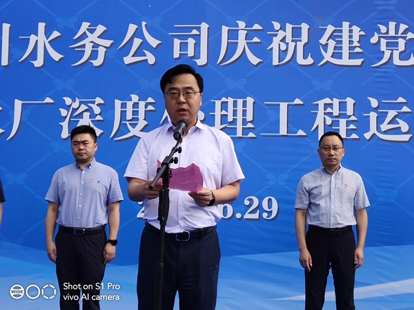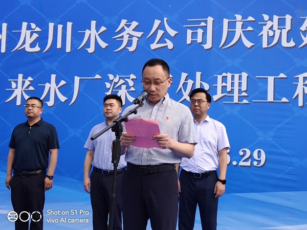 副區(qū)長楊曉榮同志代表區(qū)委、區(qū)政府作重要講話,首先對龍川水務(wù)公司第二、三水廠深度處理工程的竣工投運(yùn)表示熱烈的祝賀,并強(qiáng)調(diào)指出,水是經(jīng)濟(jì)社會發(fā)展的重要基礎(chǔ)和關(guān)鍵命脈,龍川控股集團(tuán)委托深圳環(huán)水投資集團(tuán)運(yùn)營龍川水務(wù)后,水務(wù)公司能緊緊圍繞民生所需、民眾所期、民心所盼,大力實施放心水、優(yōu)質(zhì)水工程,積極推進(jìn)供水支管網(wǎng)改造和污水管網(wǎng)、農(nóng)村污水處理設(shè)施建設(shè),為全區(qū)水生態(tài)文明建設(shè)作出了突出的貢獻(xiàn),龍川水務(wù)公司整體的質(zhì)態(tài)也有了較大的飛躍。希望以今天的通水儀式為新的起點(diǎn),不忘初心,牢記使命,乘風(fēng)破浪,穩(wěn)健前行,進(jìn)一步推進(jìn)供水事業(yè)發(fā)展,為江都的社會穩(wěn)定、經(jīng)濟(jì)發(fā)展做出更大的貢獻(xiàn)。