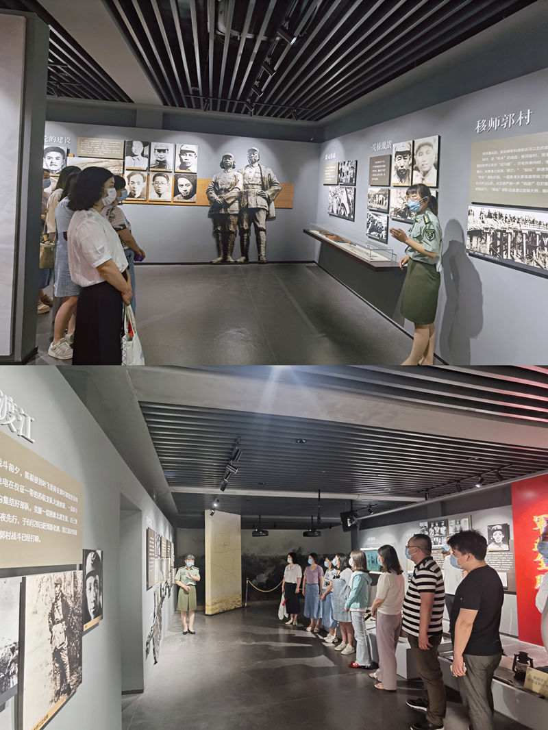 大家在講解員的引領下,先后認真參觀了郭村保衛戰紀念館、新四軍蘇北指揮部紀念館,觀看歷史圖片展覽、烈士遺物、模擬戰役場景等,在一件件珍貴歷史文物前,駐足凝視,用心聆聽革命先烈的英勇事跡。展廳里的圖片、文字、油畫、地圖、報紙剪片、音像資料等,再現了郭村保衛站當年戰役的場景,震撼人心。
