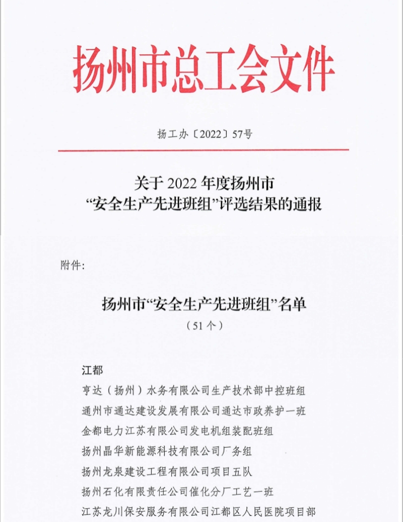 近日,我公司下屬企業揚州龍泉建設工程有限公司項目五隊被揚州市總工會授予2022年度揚州市“安全生產先進班組”榮譽稱號。